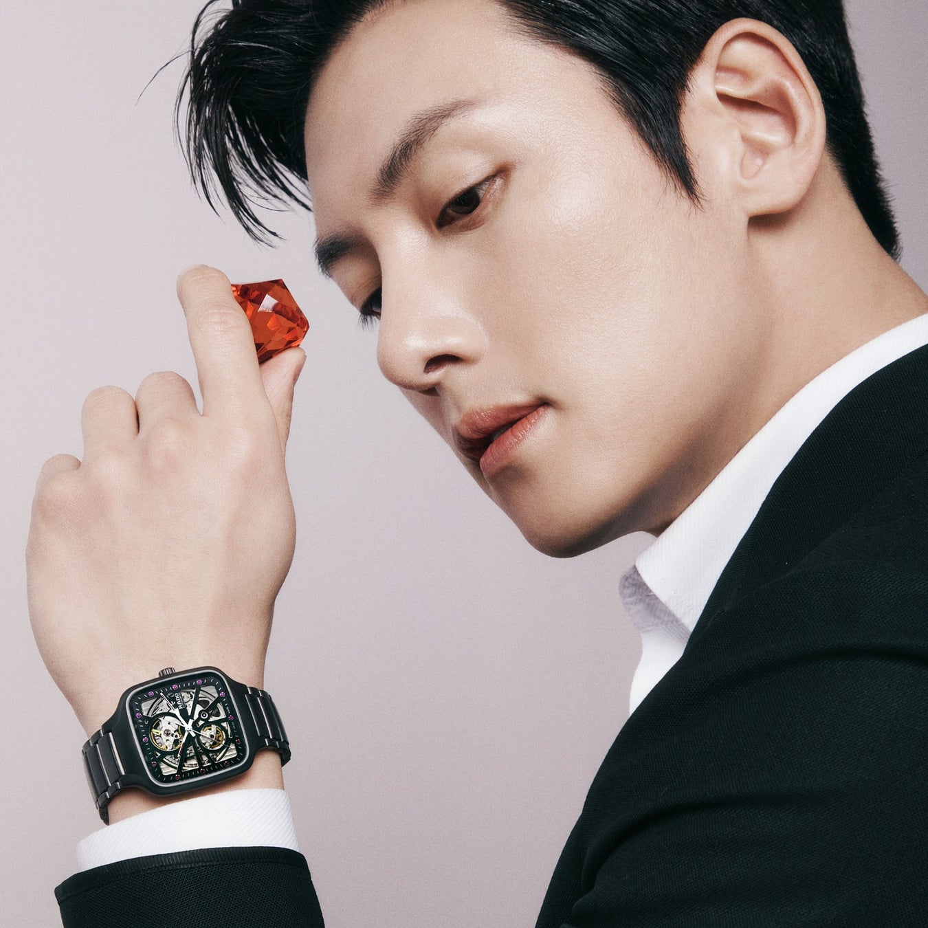 ダイヤルには、チ・チャンウクの誕生石でもある12個の鮮やかなルビーをインデックスとして配しており、ミニッツマーカーはホワイトプリントで縁取りされ、繊細なディテールを際立たせています。