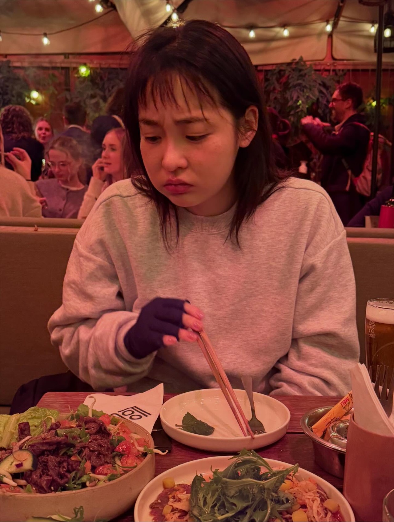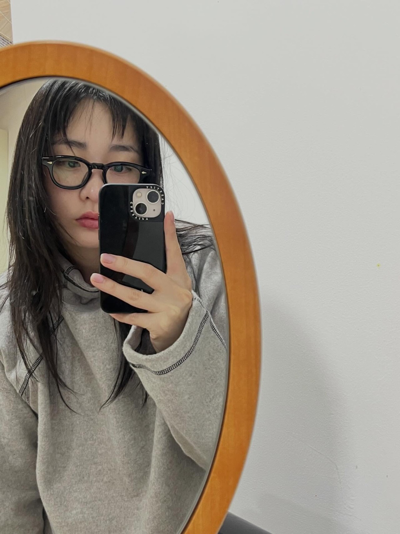 投稿された写真には、鏡越しのセルカから食事の場面、カフェでのひとときまで、日常のさまざまな瞬間が収められています。グレーのスウェットにブラックニットというシンプルな装いでも、ひときわ目を引く雰囲気を放っています。無造作に下ろした前髪と、少し濡れたような質感のヘアスタイルは、自然体でありながらシックなムードを演出。眼鏡をかけた姿では、また違った知的な魅力が際立っています。