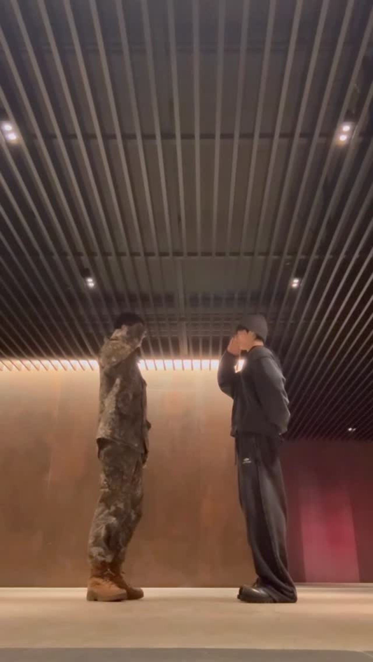 ハイライトはエンディングでした。 振り付けを終えたチャウヌが、JUNG KOOKに向かって「忠誠!」と敬礼すると、JUNG KOOKは後ろ手に組んだまま余裕たっぷりに「団結」と応じ、爆笑を誘いました。 チャウヌは「ありがとうございます」と軍人らしい締めくくりまで加えました。
