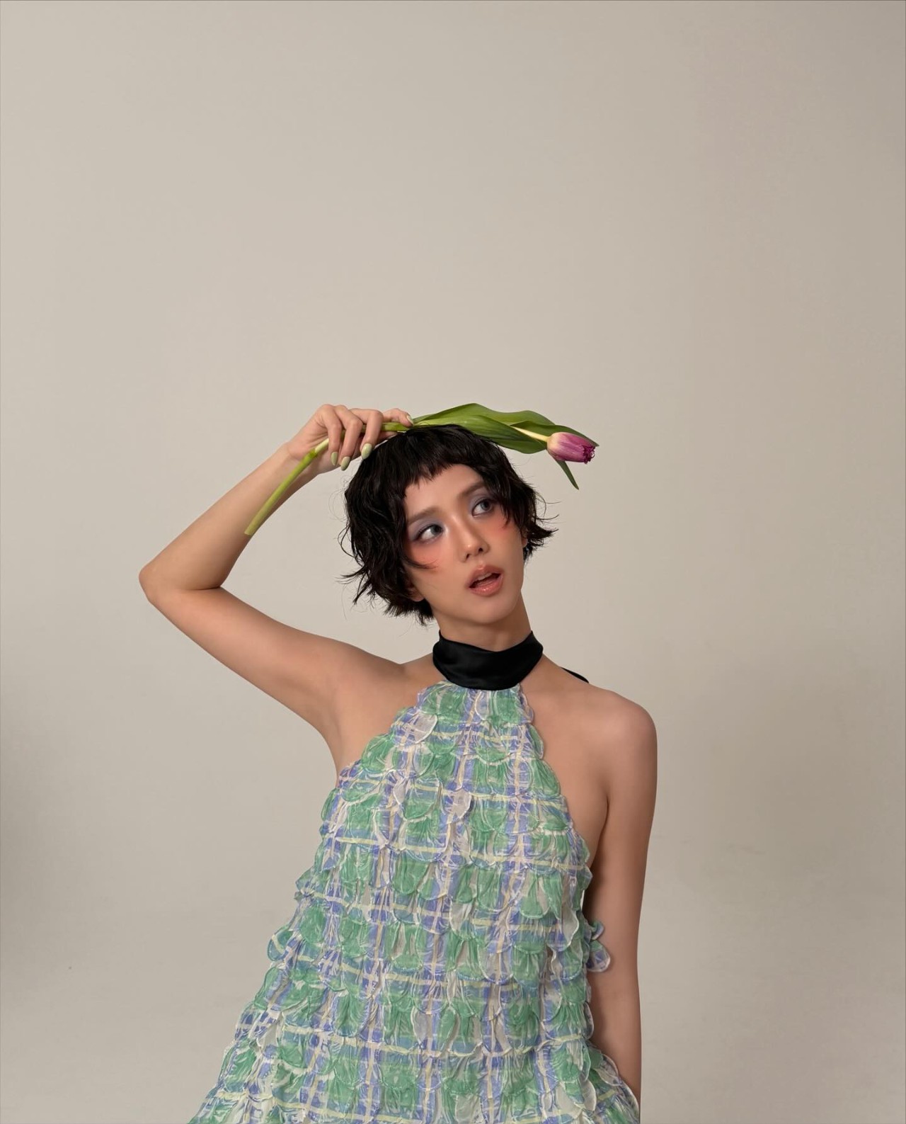 グラビアカットでは、ホルターネックドレスを着てシックなコンセプトを完成させました。 ドレスは肩と脇腹が露わになるデザインで、ジスはショートヘアスタイルと強いアイメイクを組み合わせて新鮮なイメージを表現しました。 片手にチューリップを持ち上げてユニークなポーズを取り、コンセプトの消化力を示しました。