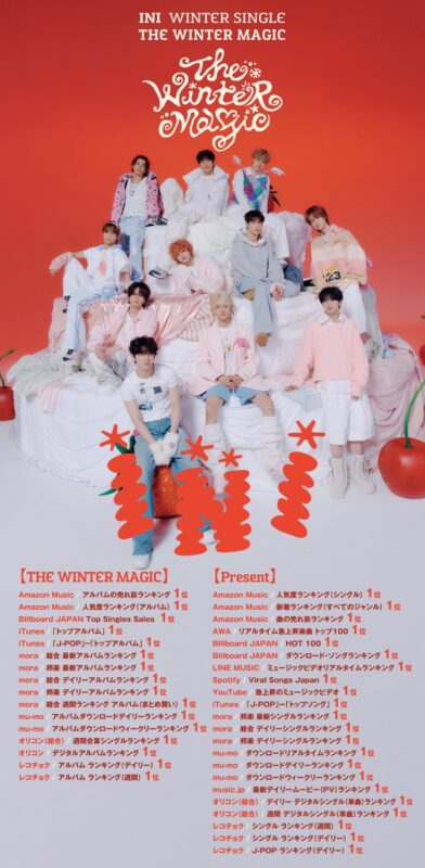グローバルボーイズグループINIが11月19日(水)にリリースしたWINTER SINGLE『THE WINTER MAGIC』が1週間で121万枚を売り上げ、国内における今年度最高のシングル初週実績および自己最高記録を更新。「BillboardJAPANTopSinglesSales」「BillboardJAPANHot100」(2025年11月26日公開)や「オリコン週間シングルランキング(2025年12月1日付)などで堂々の1位を獲得したほか、楽曲ダウンロードやラジオなど各種音楽チャートでも続々と1位を獲得しています。