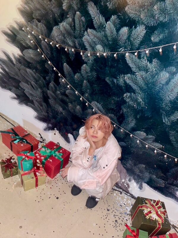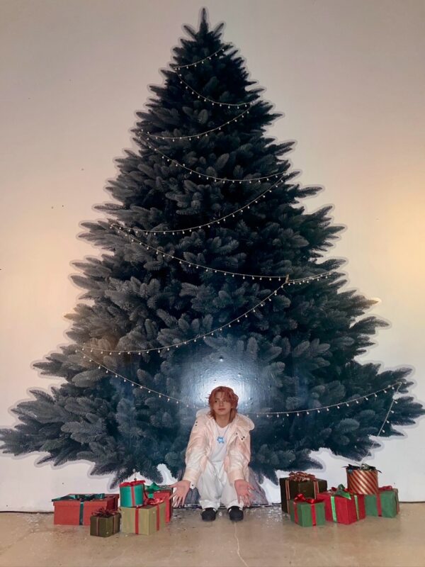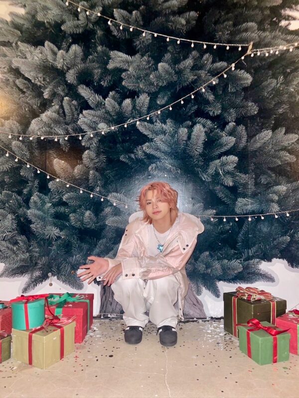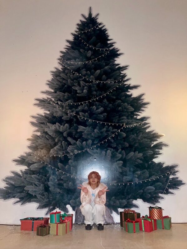 松田迅は、たくさんのプレゼントに囲まれてクリスマスツリーの下に座っている。