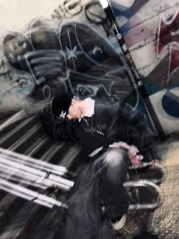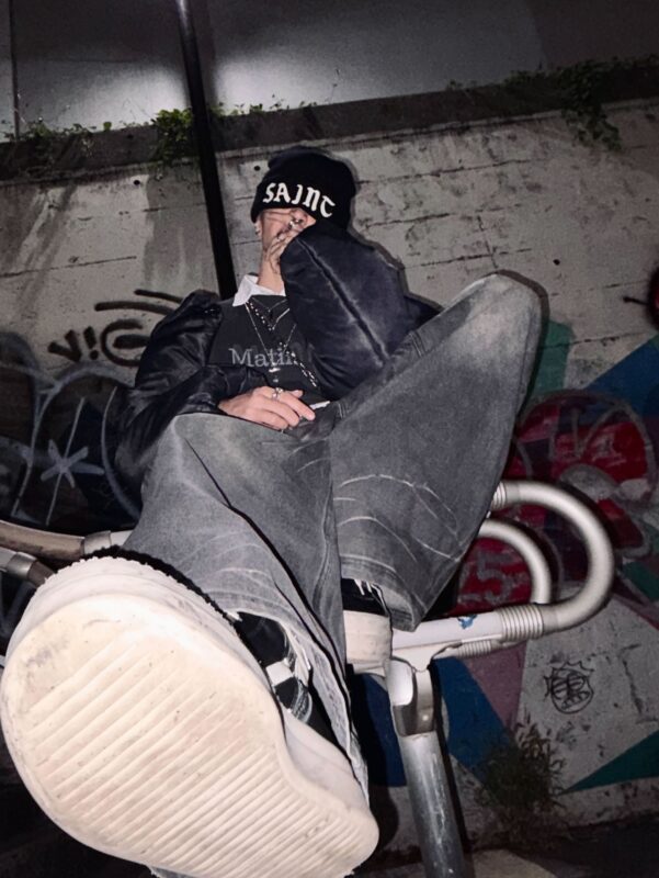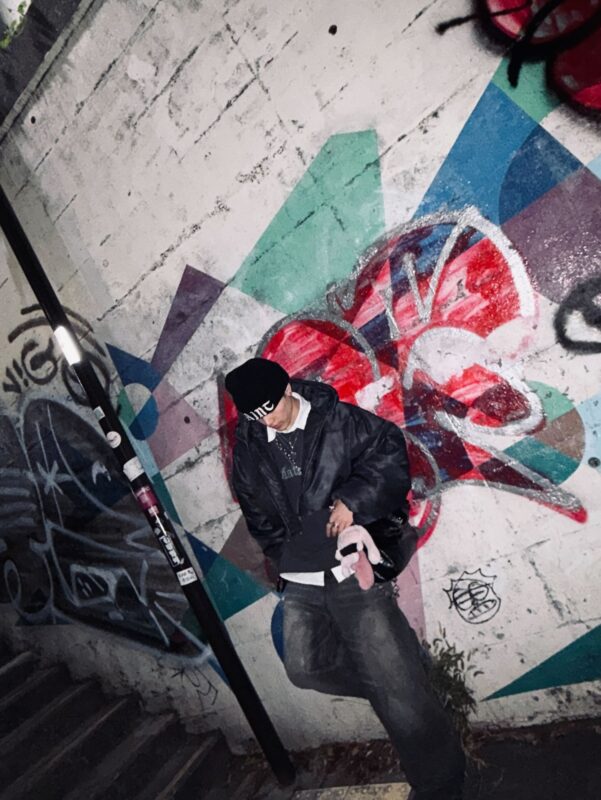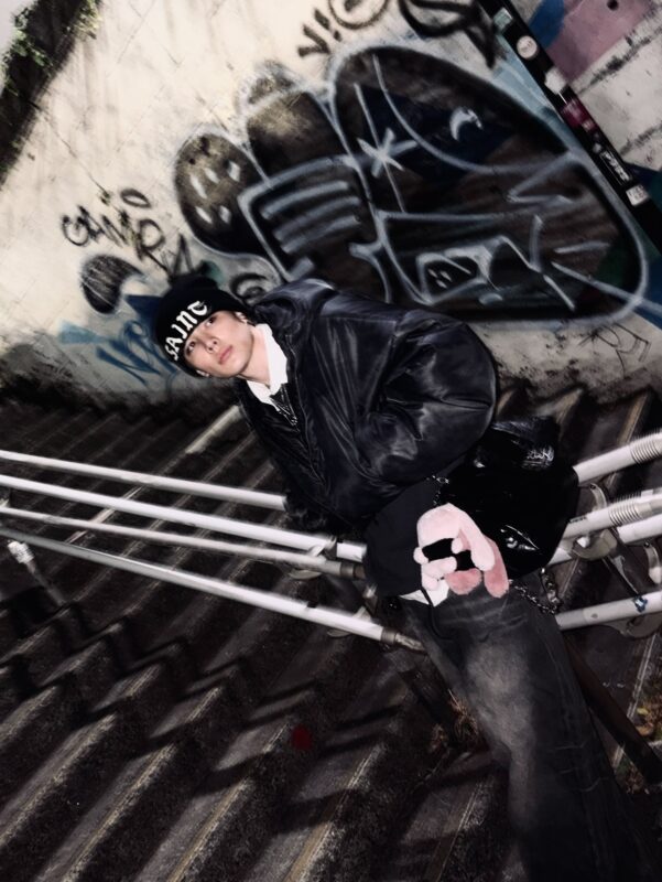 マキは、ニット帽にシューズ、メガネまでブラックトーンでまとめたストリートルックで自由な雰囲気を発散している。