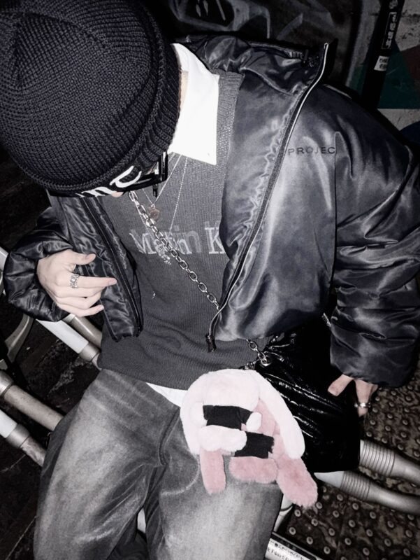 強烈なオーラと共にシャイな雰囲気を醸しだしているマキは、バッグのピンクのぬいぐるみでキュートな魅力も見せている。
