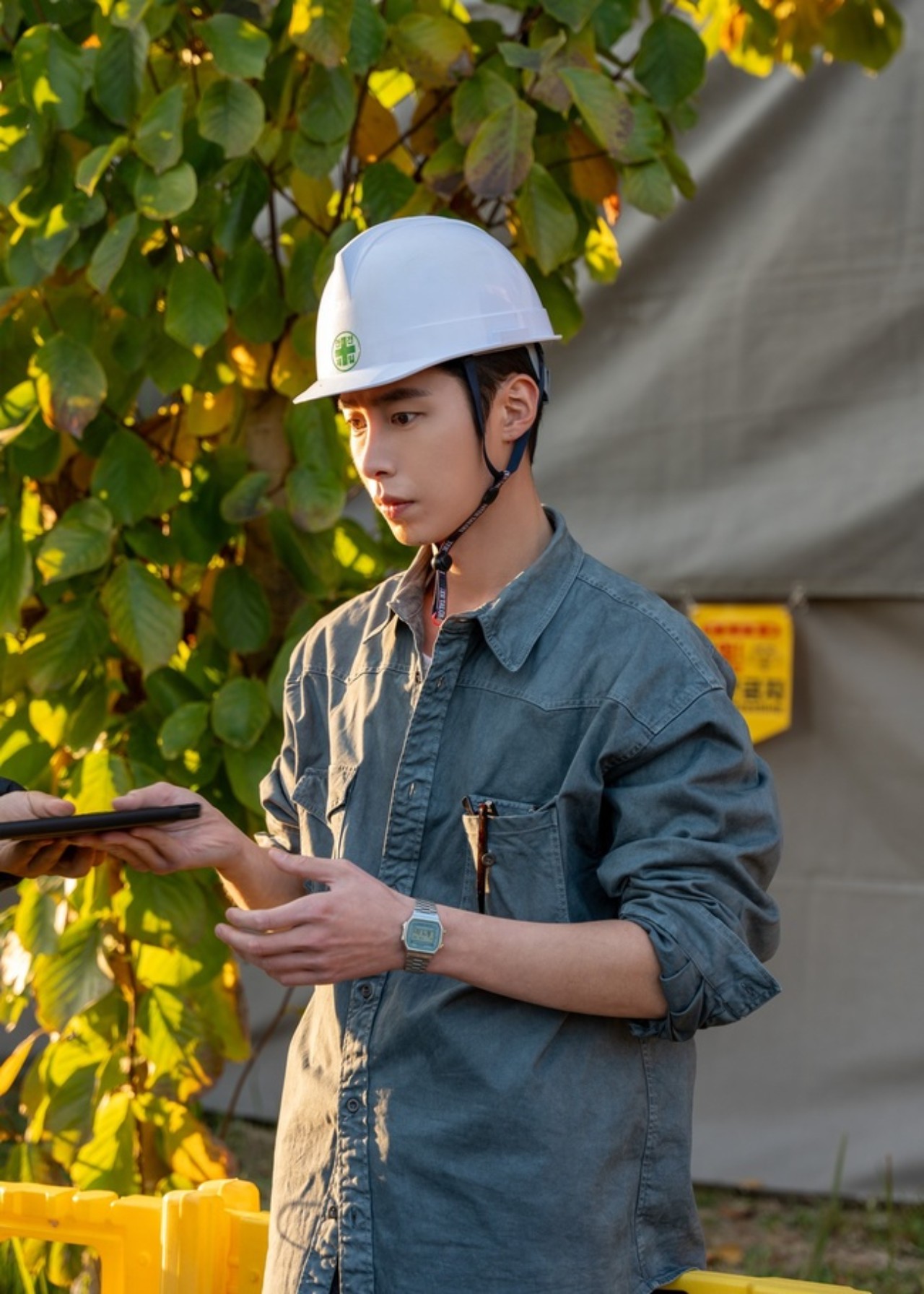 別の写真では、作業用手袋と土埃のついた作業服姿のドハと、ヘルメットを装着して現場を駆け回るプロフェッショナルな姿が映し出されました。 荒々しい現実の中でも落ち着いたカリスマを放ち、見る者の視線を一瞬で釘付けにしました。
