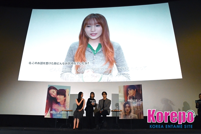 さらに、もう一つのサプライズ映像として、ドラマ挿入歌「Cafe Latte(English Version)」を歌った幾田りらからのメッセージも到着。映像を見たパク・ソジュンは「OSTに参加されるということを初めて聞いたとき、とても驚きました。普段から好きなアーティストでもあるので、このように一つの作品を一緒に作れることができて不思議な感じでしたし、感謝の気持ちでした。曲がとても気になっていたのですが、聴いてみると、ドラマの中にはいろんな感情が盛り込まれているのですが、中でも明るくて軽快な部分を現して活かしてくれたような曲でしたのでとても感謝しています。いつかお会いしたいです」と伝えた。ウォン・ジアンは「普段から好きなアニメのOSTに参加されている歌手として以前から知っていたのですが、こうして『明日はきっと』のOSTに参加されるというのを聞いてとても不思議な感じでしたし、とても楽しみにしていました。こうしてメッセージも送っていただきありがとうございます。曲は溌剌としていて可愛い感じに仕上がっているので、ドラマにどのように出てきて仕上がっているのかとても気になります」と伝えた。