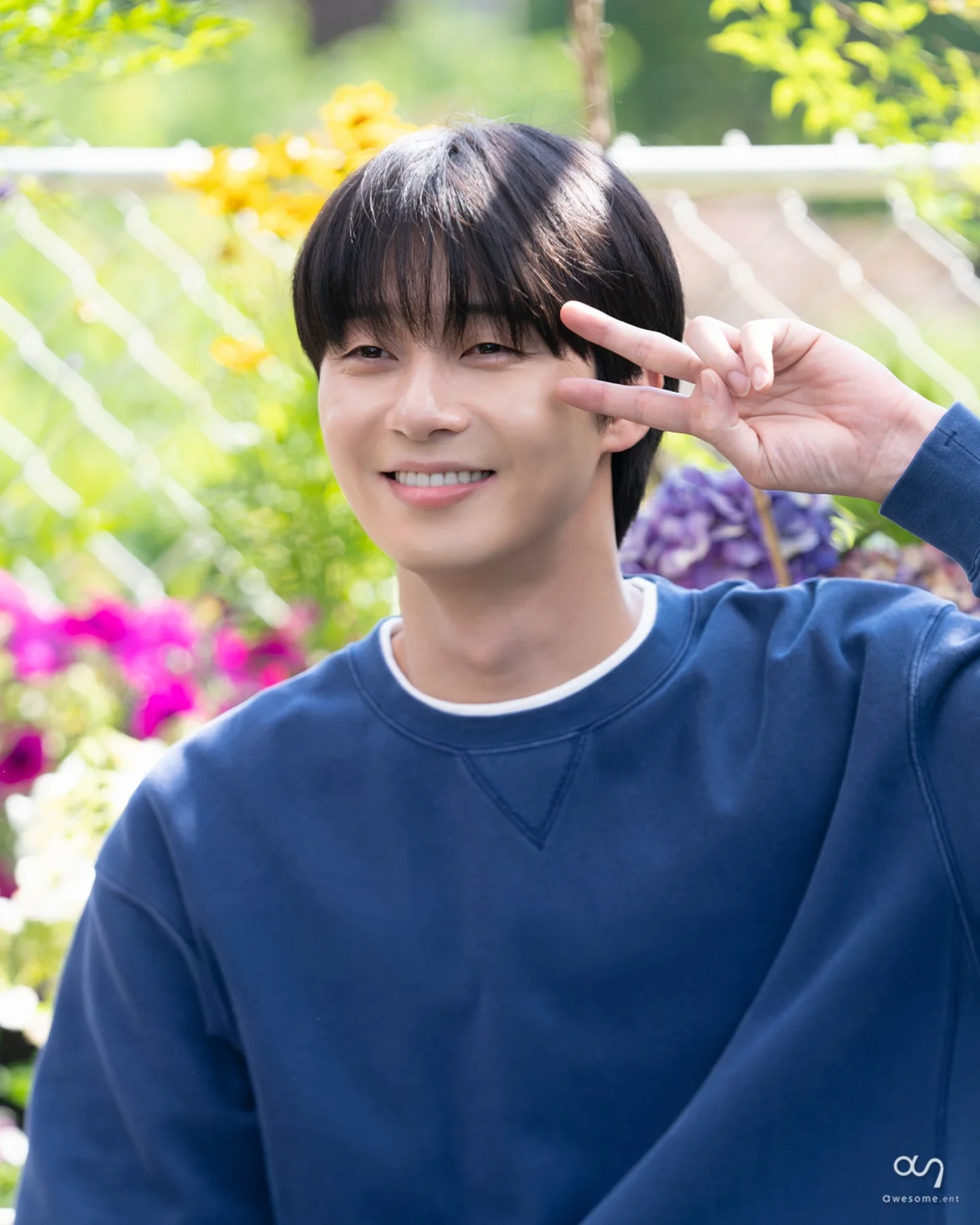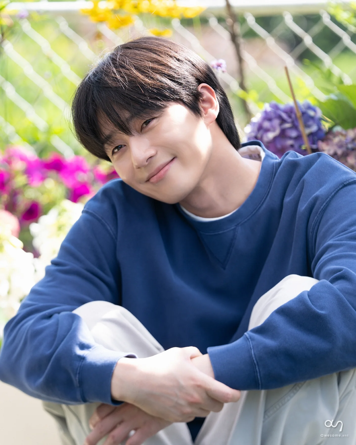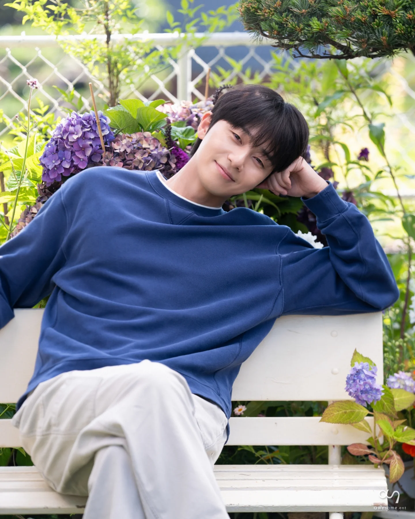 写真には、ブルーのトレーナーを着てアジサイの花が咲くベンチに座っているパク・ソジュンの姿が盛り込まれている。