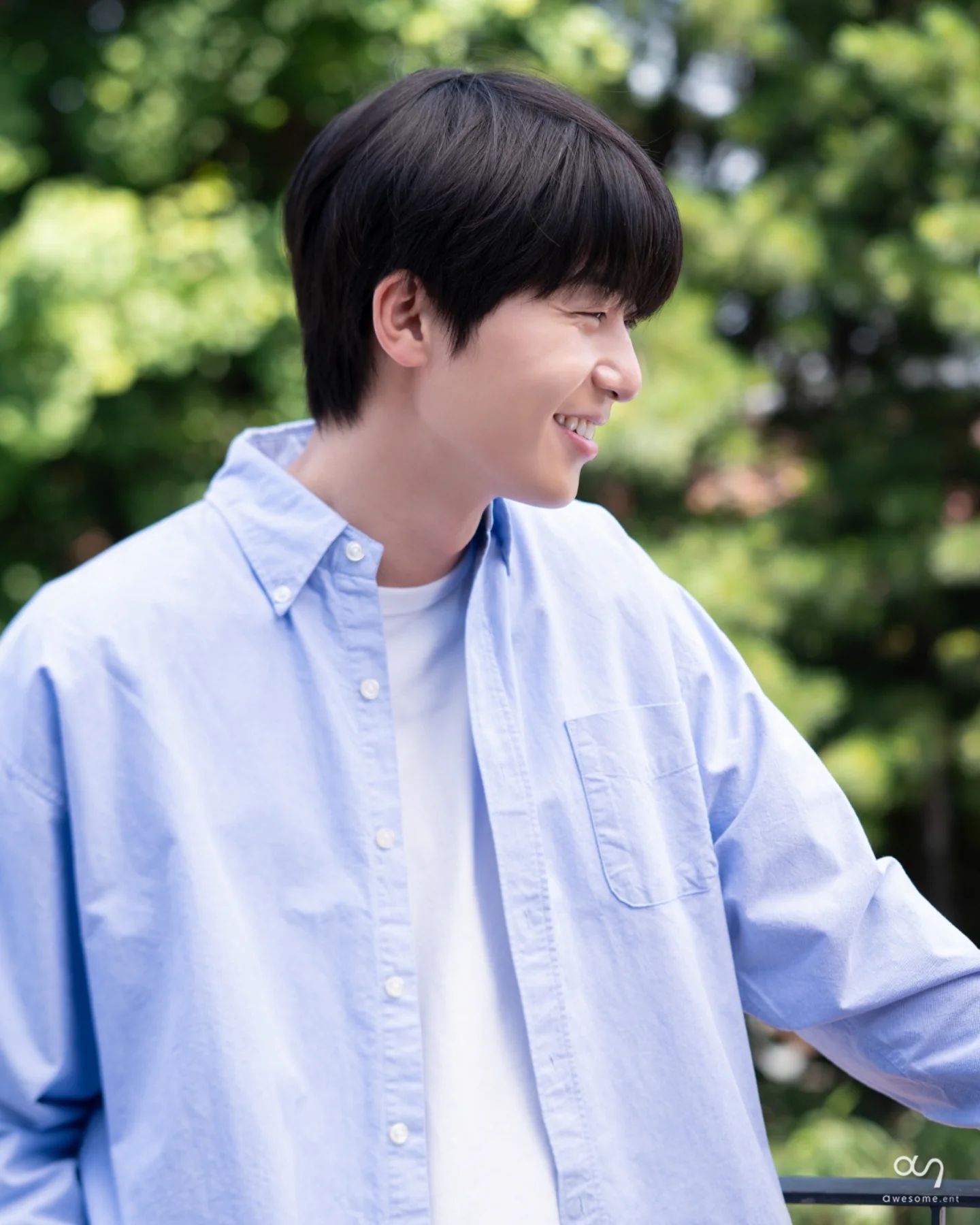別の写真でパク・ソジュンはさわやかなライトブルーのシャツを着た姿で明るい笑顔を見せている。