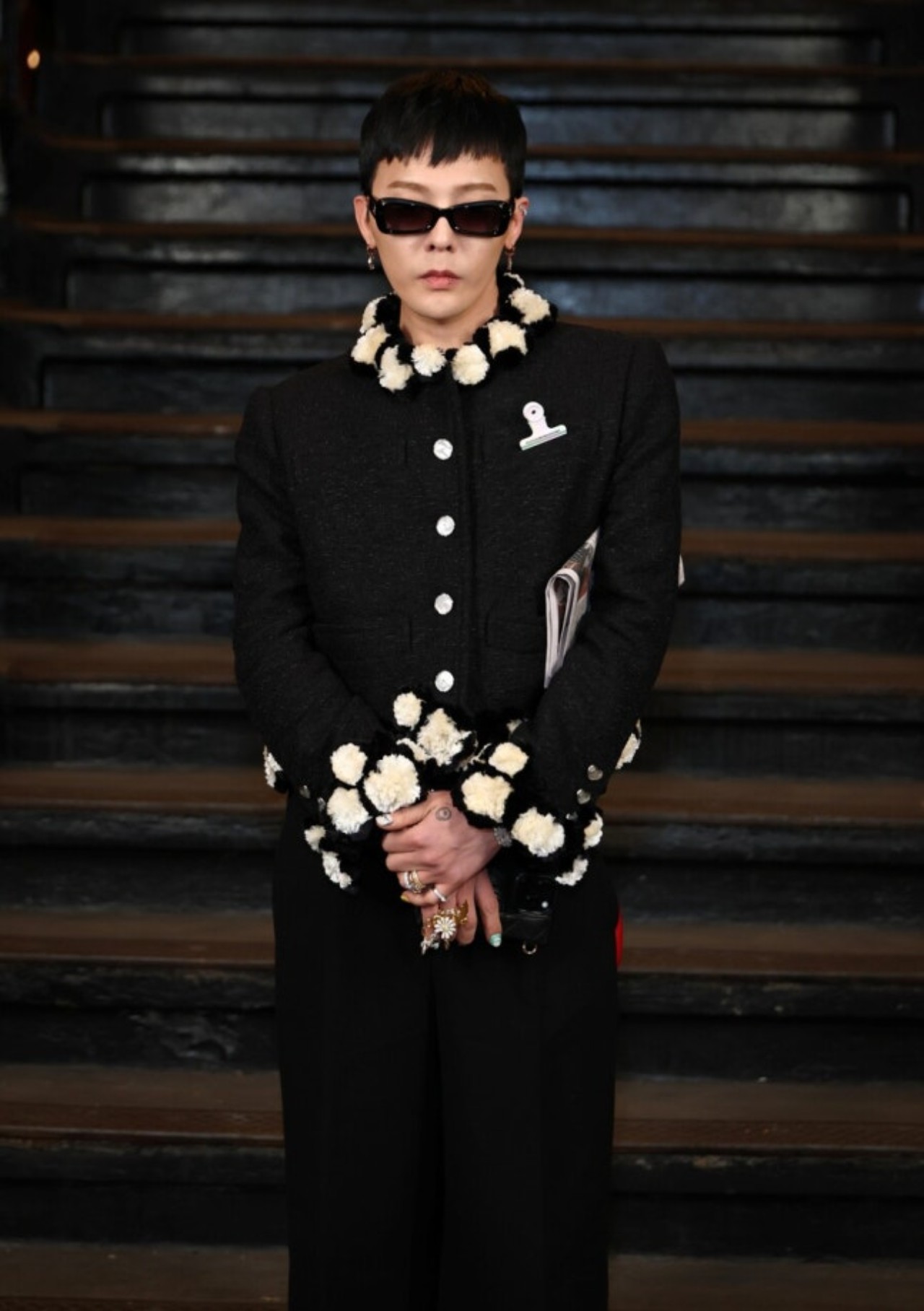この日G-DRAGONは、「2026年春夏レディ・トゥ・ウェアコレクション」のルック26番のジャケットとプルオーバー、そして同コレクションのレザーベルトを着用しました。 さらに「2025/26秋冬レディ・トゥ・ウェアコレクション」のサングラスと「2026ホリデーコレクション」のリングを合わせて、抑制されたようでいて強烈な“シャネルルック”を完成させました。