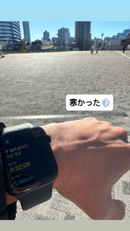 写真にはスマートウォッチを身に着けた手と共に「寒かった」と日本語で書かれた文が盛り込まれ、注目を集める。スマートウォッチには、室外ランニング、合計時間32分8秒、合計距離5.4㎞と表示され、寒い天候の中運動したことを推測させる。