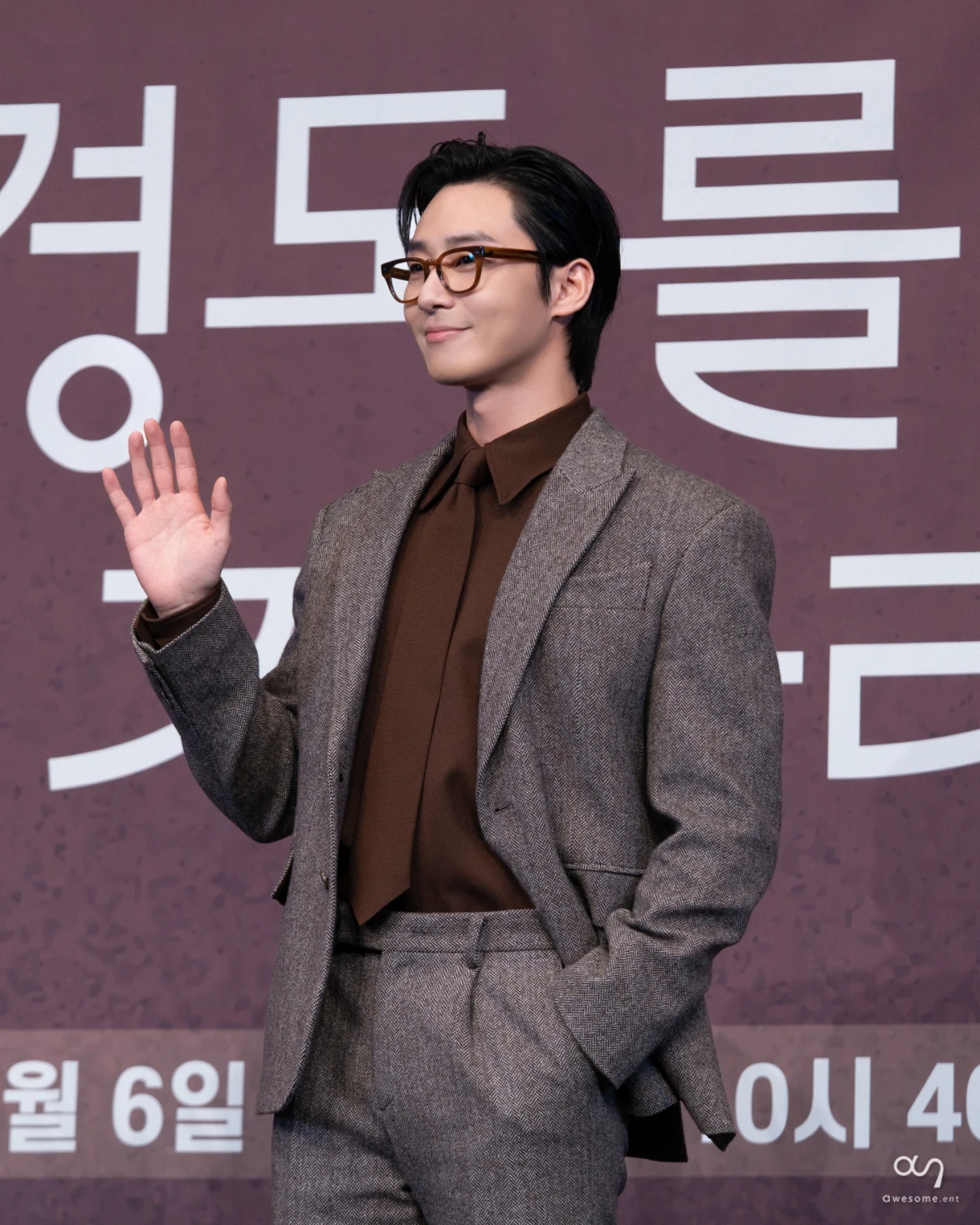 パク・ソジュンはブラウン系のスーツ姿でシックな魅力をアピールしている。