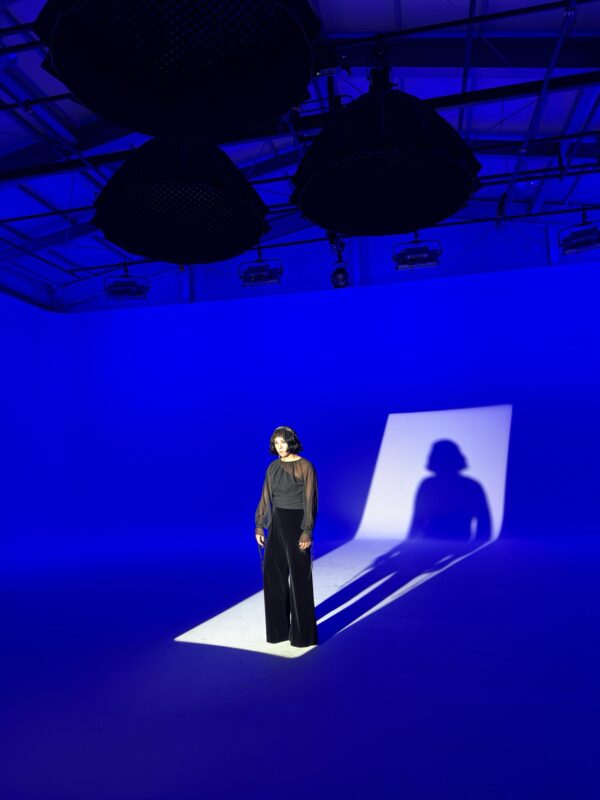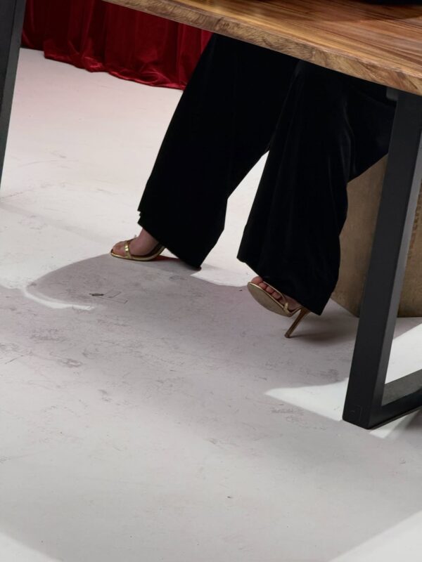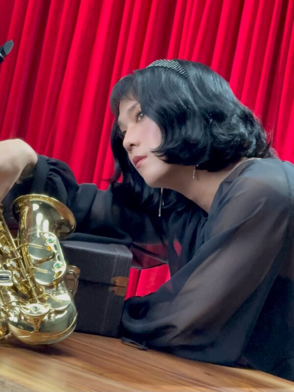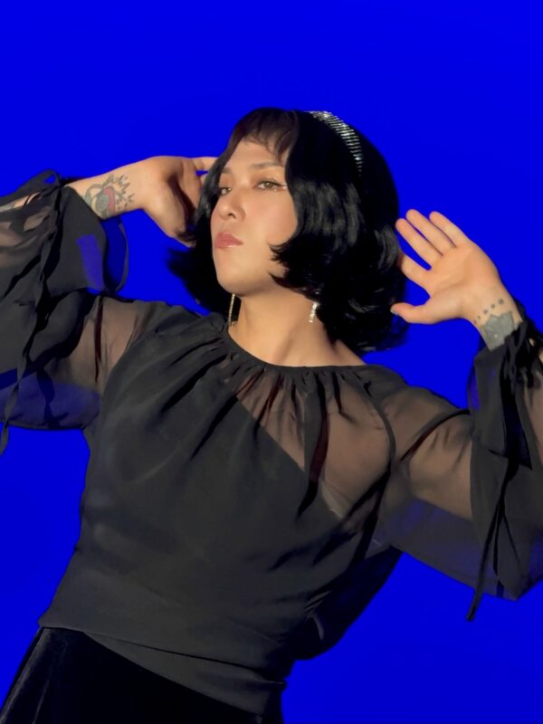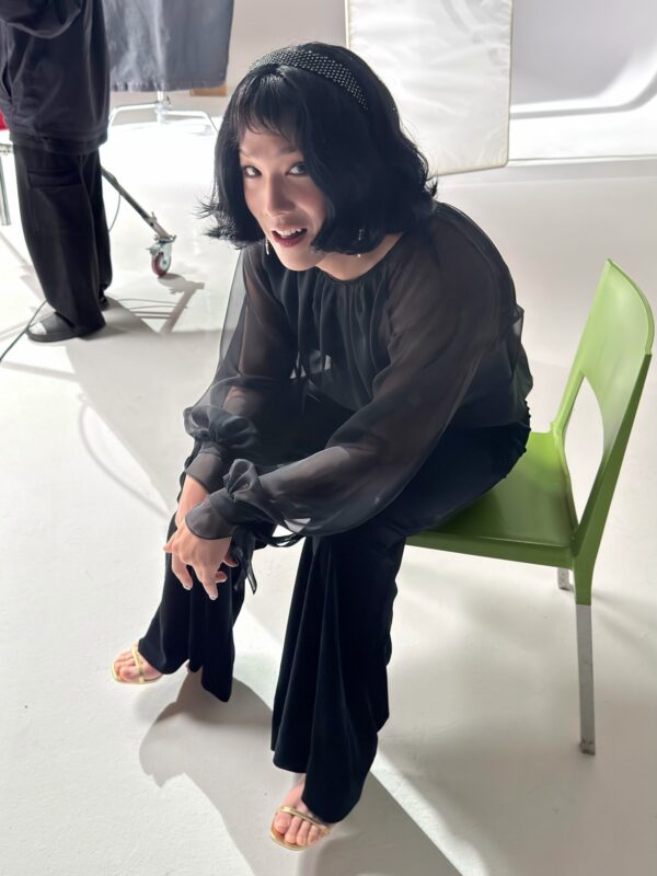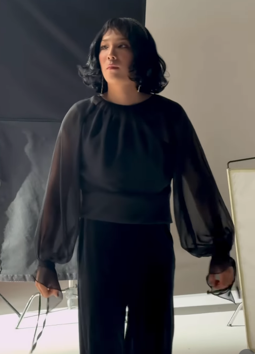ホンギは、ボブスタイルのウィッグを付けてシースルーのブラウスを着てハイヒールを履いている。