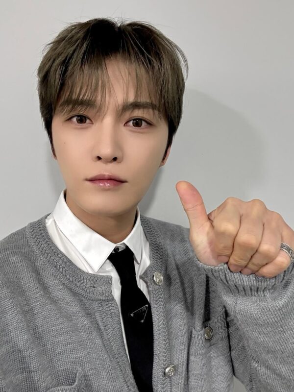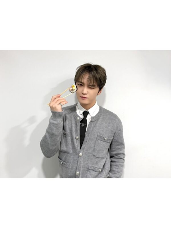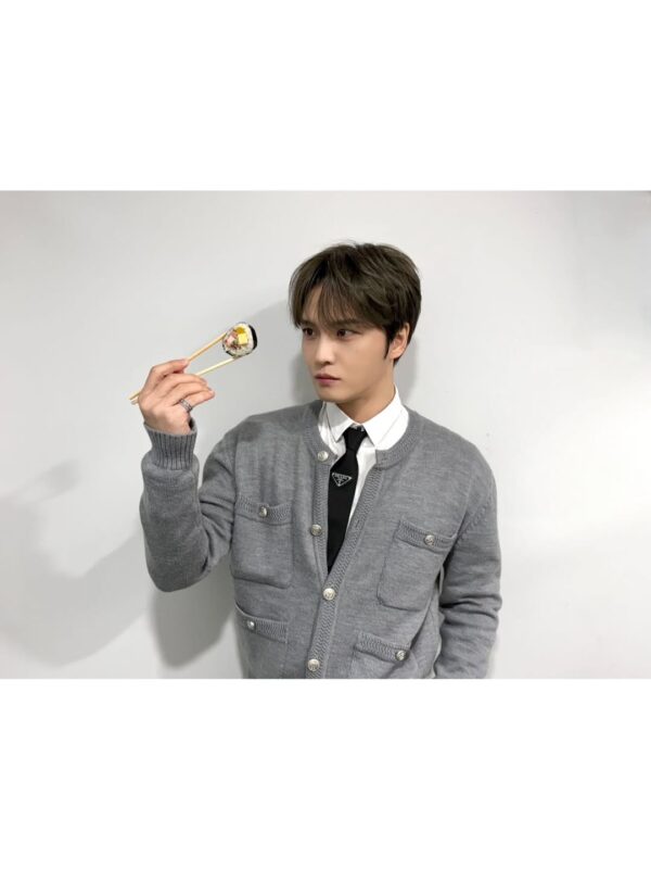 写真には、ネクタイにグレーのカーディガンをマッチさせたジェジュンの姿が盛り込まれている。