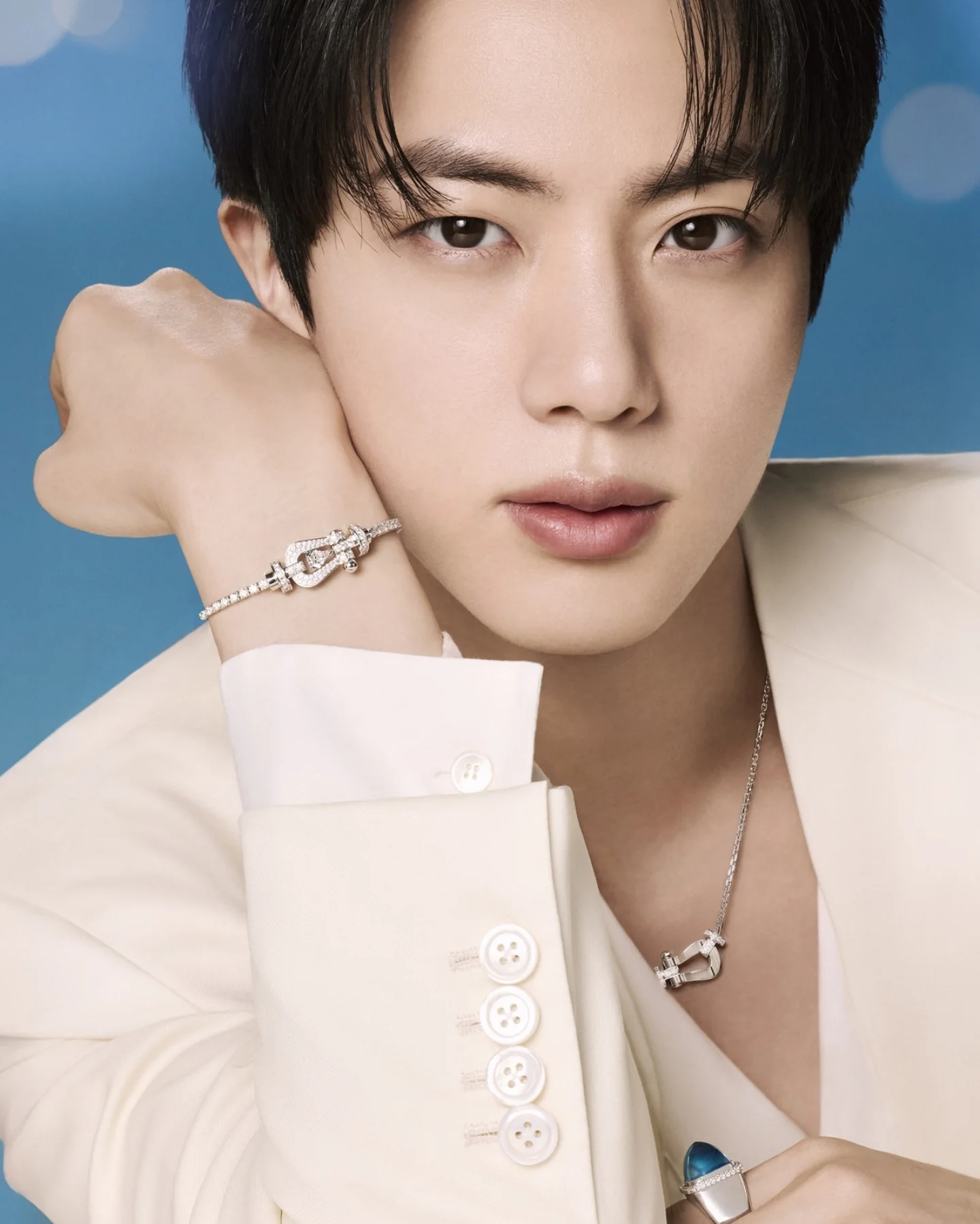 JINは12日、自身のInstagramに「FREDJewelry」とタグ付けしていくつかのハッシュタグと共に写真を掲載した。