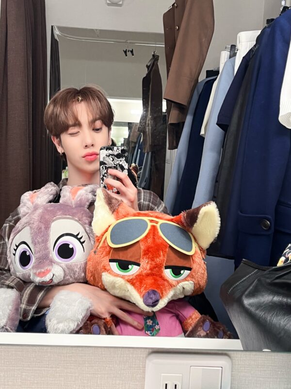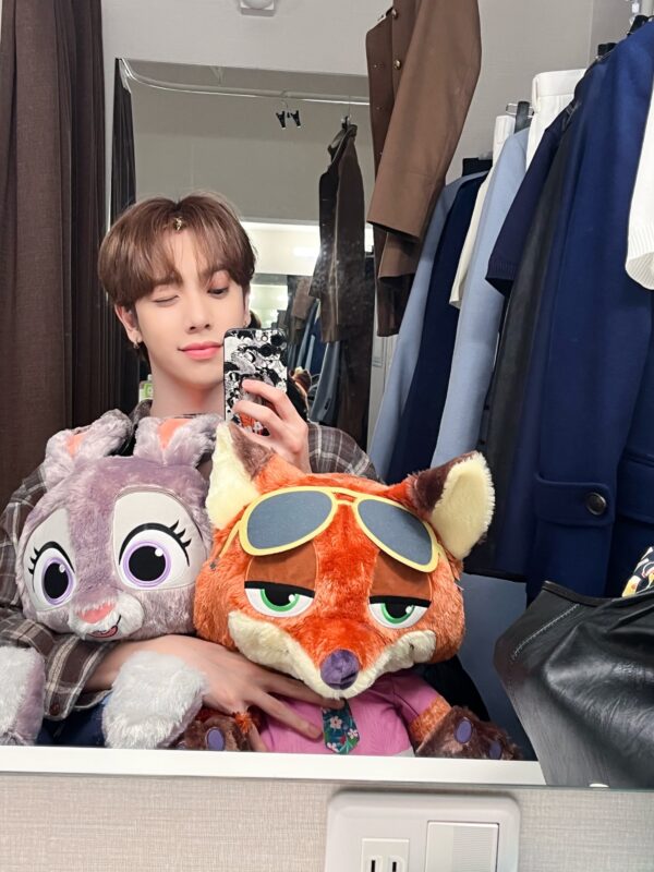 写真には、大きなぬいぐるみを抱いてミラーセルカを撮っているカズタの姿が盛り込まれている。