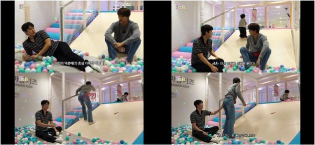 これに対しイジンくんは「ダメ」と言い、カイとセフンは残念な気持ちで足の指を離し、笑いを誘いました。 やがてイジンくんは、自分と遊んでくれたセフンとカイにそれぞれチューをして、制作陣を驚かせました。