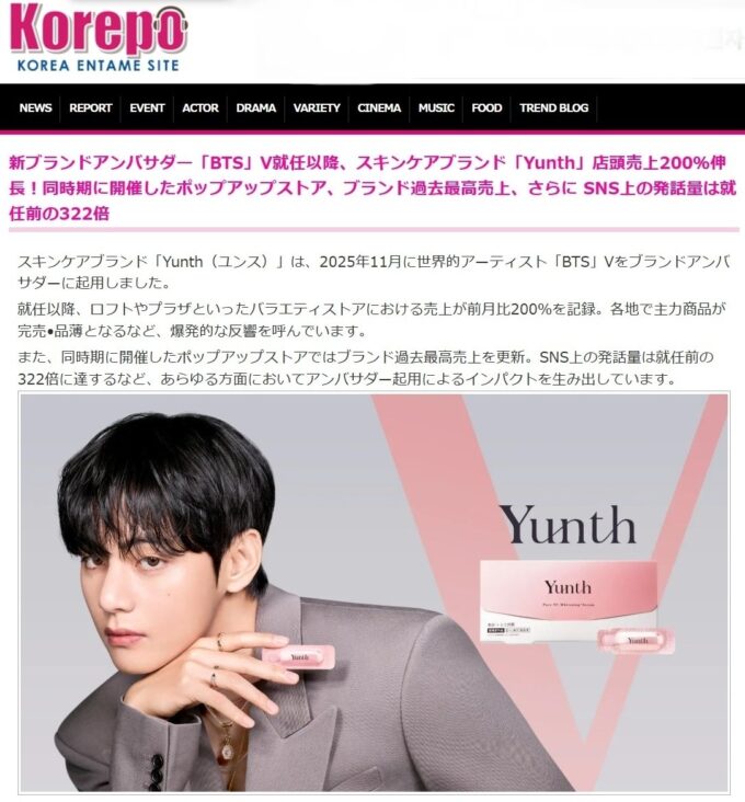 K-カルチャーを扱う日本メディアの「コレポ(Korep)」は最近、Vが日本ビューティブランド「Yunth」のグローバルアンバサダーに選ばれてから1か月で売上200%という爆発的な増加を記録したと伝えた。