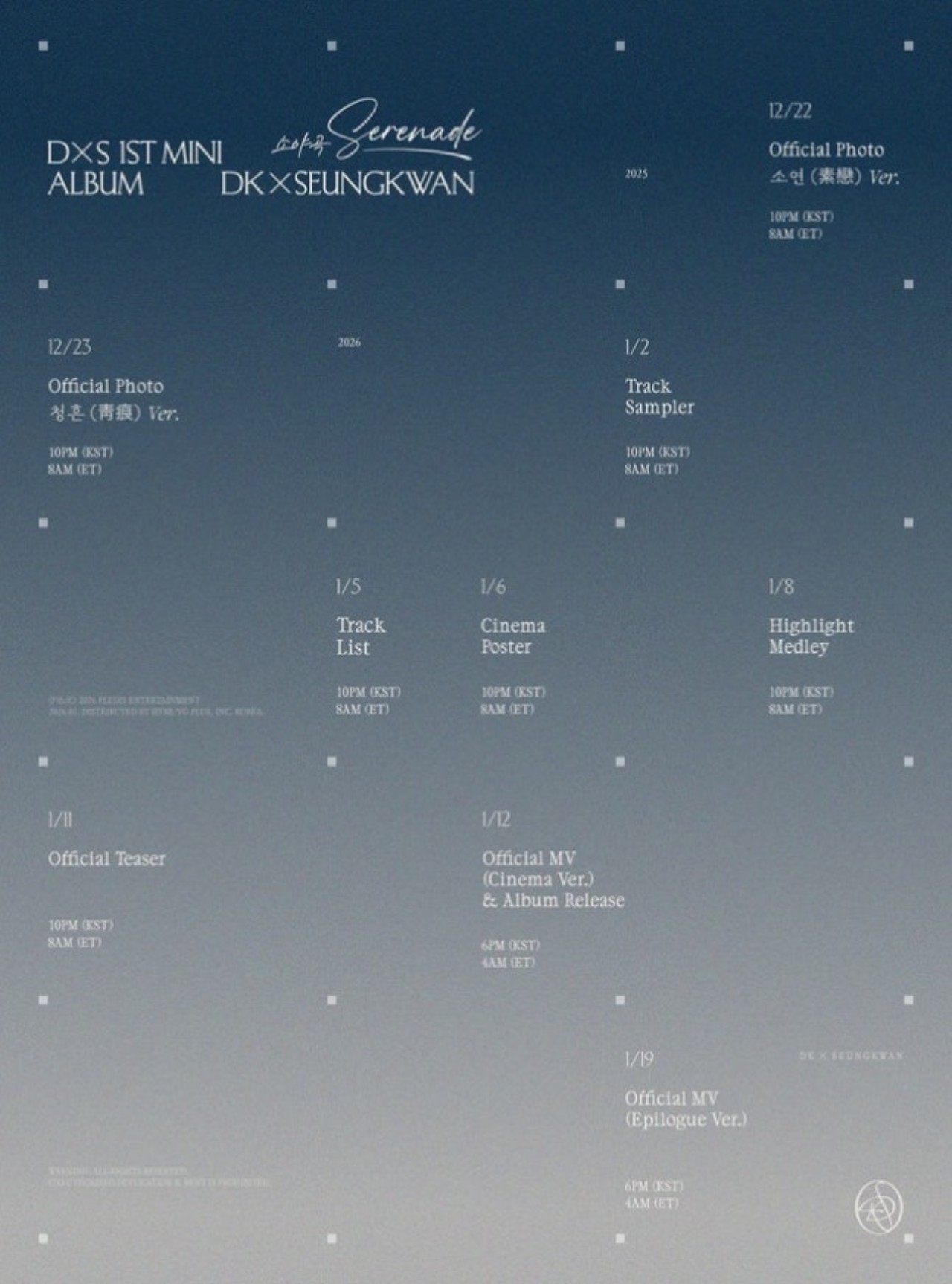 「小夜曲(Serenade)」は、「夜に歌う愛の歌(セレナーデ)」を意味します。 DK×SEUNGKWANは倦怠とすれ違い、新たな始まりまで、最も普通の愛の中の様々な瞬間を音楽で表現し、誰もが共感し没入できるアルバムを完成させました。 「SEVENTEEN」の二大メインボーカルとして確かな歌唱力と深い感性を認められた2人は、様々な活動で“K-POP正統ボーカルデュオ”の存在感を刻み込む予定です。