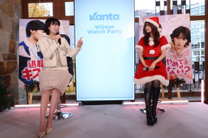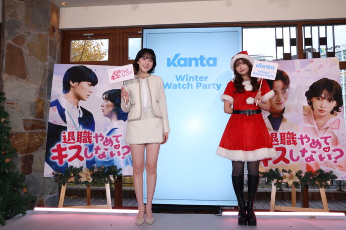 そして、本日12月19日(金)Kantaオリジナルショートドラマ『退職やめてキスしない?』公開を記念し、「Kanta Winter Watch Party」が開催。本作は、中堅出版社で働くユビンが犬猿の仲の有能な同期・ソンヒョンの転職を知り、仕事量増加を防ぐため、通称「退社防止フローティング(駆け引き)」を開始。不器用でぎこちないアプローチに失敗続きながらも、次第に本物の恋が芽生える、笑いあり胸キュンありのオフィス・ラブコメディ。主演・ユビン役を務める知英(KARA)が、この冬大注目の“オフィス・ラブコメディ”新作にちなみ、真っ白に煌めくオフィスコーデで登場!本日のコーディネートのポイントを聞かれると「今日は現実的なオフィスコーデにしようか悩んだのですが、皆さんの前でドラマを披露する場なので、特別な“スペシャルオフィスルック”にしました」と紹介。まるでクリスマスツリーのようにキラキラと輝く華やかな装いで、会場をパッと明るく彩った。『退職やめてキスしない?』の見どころを聞かれると「ラブコメディ自体がすごく久しぶり」と笑顔を見せつつも、相手役のソンヒョンを演じたイ・テファンについて「実は大学の同期だったんです」と驚きのエピソードが飛び出す。「彼とは昔から友だちだったので、現場でもすごく楽しく一緒に撮影できました。その雰囲気が作品の出来上がりにも出ているんじゃないかなと思います」と、気心の知れた間柄だからこそ生まれる相性の良さに自信を見せた。Kantaは1話1分という「縦型ショートドラマ」となるが、通常のドラマや映画などの撮影とは少し勝手が違ったという。「Kantaさんのドラマに出るのは二回目。前はヴァンパイア役で、その時は強い役柄でしたが、今回は明るいコメディ。ただ縦型ドラマの撮影にはまだ慣れていなくて・・」と苦笑い。「普通のドラマなら相手と離れていても(画角に収まるので)いいのですが、縦型だとツーショットを撮るために『もっと寄ってください』と指示されるんです。『え?こんなに近いのに』と思うくらい。やはり縦(の画面)に2人を入れないといけないからそうなるんだな、というのが違いで。勉強させていただきました」と様々な作品に出演してきた知英も新たに学んだことが多かったようだ。