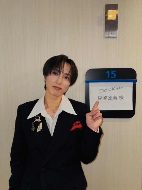 写真で尾崎匠海は、楽屋の前でカメラに向かってポーズを取っている様子を公開した。