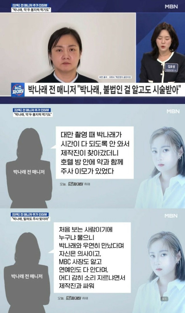 19日に放送されたMBNのニューストーク番組「キム・ミョンジュンのニュースファイター」では、パク・ナレの元マネージャーのインタビューが公開された。元マネージャーは、「台湾でバラエティー番組『私は1人で暮らす~シングルのハッピーライフ』を撮影していた当時、パク・ナレが“注射おばさん”と同行した事実が知れ渡り、問題がふくらんだ」とし、「不法だという点を、パク・ナレも知っていただろう」と主張した。