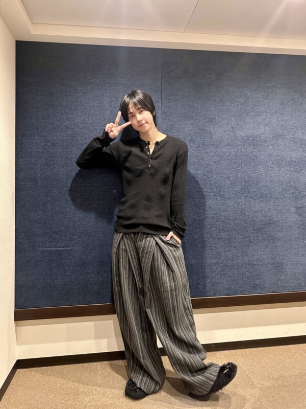 写真には、ブラックのシャツとたてストライプのパンツをマッチさせたタキの姿が盛り込まれている。
