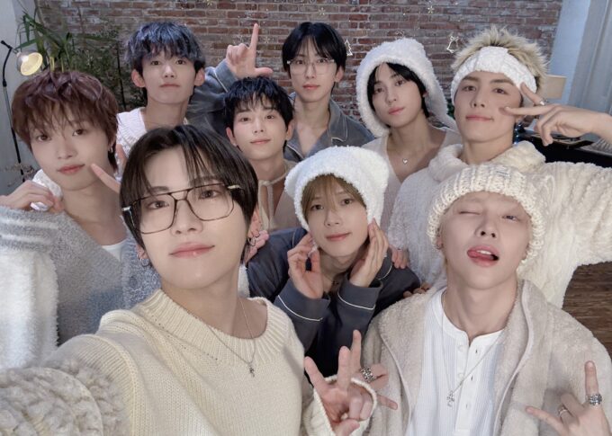 写真には、ホワイトのニットを着てホワイトのヘアバンドやニット帽をかぶっている「&TEAM」の姿が盛り込まれている。