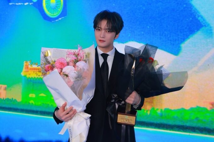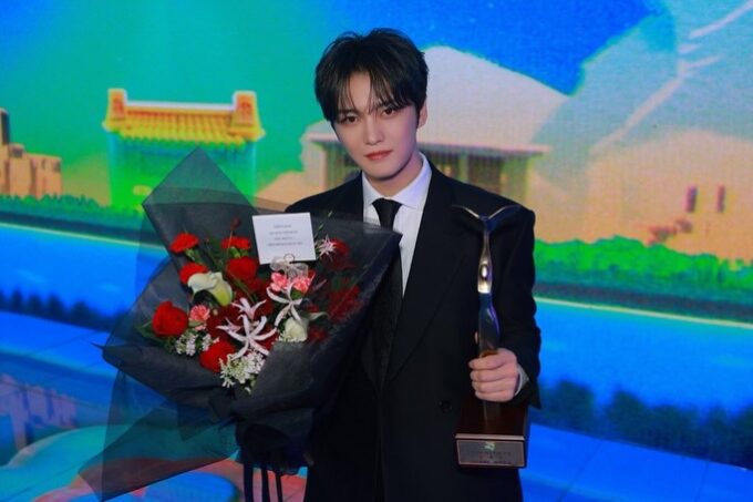 写真には、両手に花束とトロフィーを抱えてカメラに向かっているジェジュンの姿が盛り込まれている。