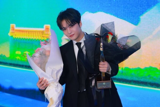 ジェジュンはオーソドックスなネイビーのスーツ姿で受賞の喜びをかみしめている様子だ。