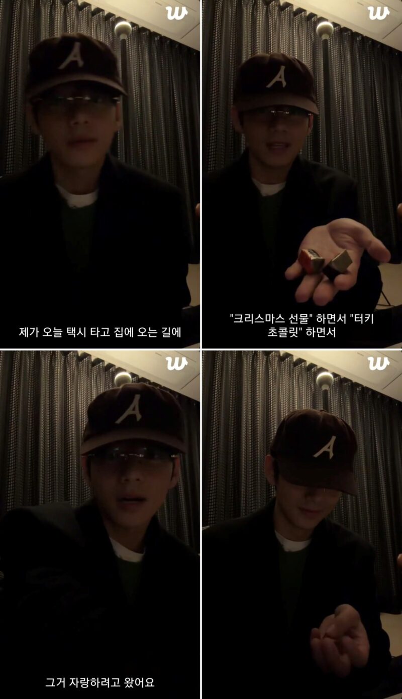 Vは「私が今日タクシーに乗って家に帰る途中で、タクシーの運転手が『これはびっくりのプレゼントです。クリスマスプレゼントのトルコチョコレート』と言いながらくれました。それで、本当に『ありがとうございます』と言って受け取りました。それを自慢したくて来ました」と話した。