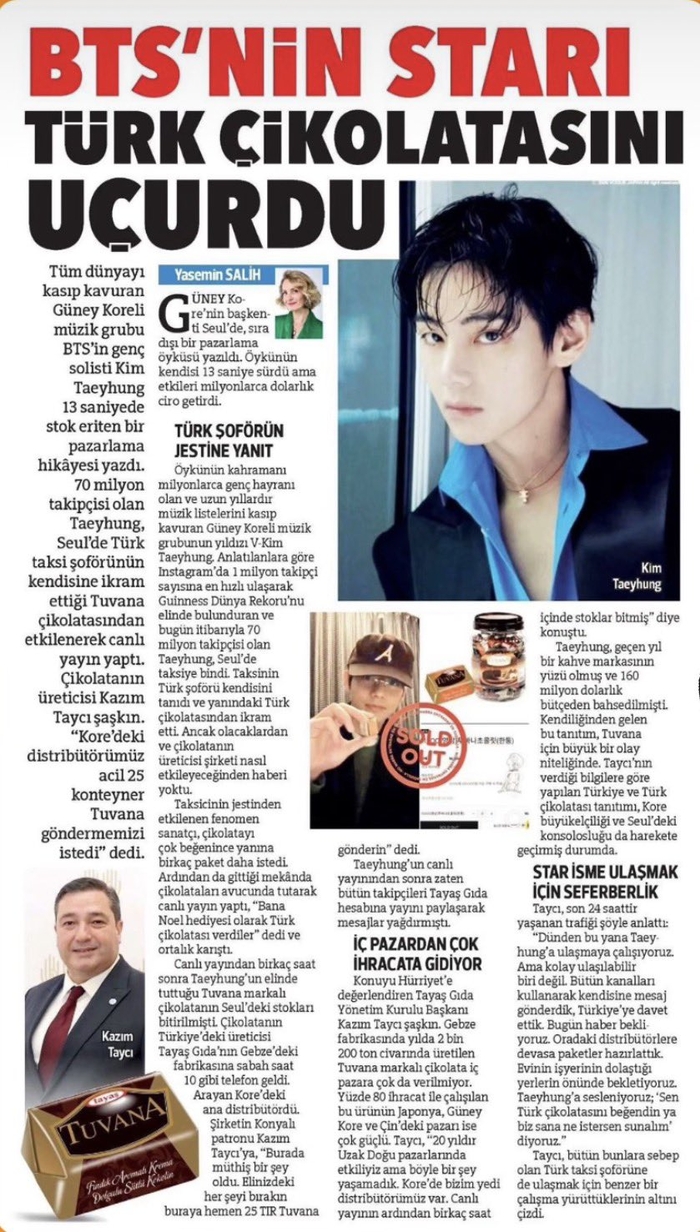 「ヒュッリイェト」は「7000万人のフォロワーを保有したキム・テヒョン(V)が、タクシーの運転手が渡した「TUVANA」のチョコレートに感銘を受けてライブ放送を行った。その後、韓国の流通業者が『TUVANA』のチョコレートのコンテナ25個分を緊急で注文した」と伝えた。