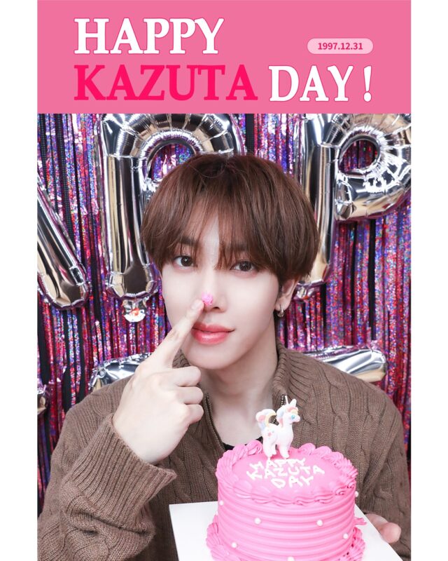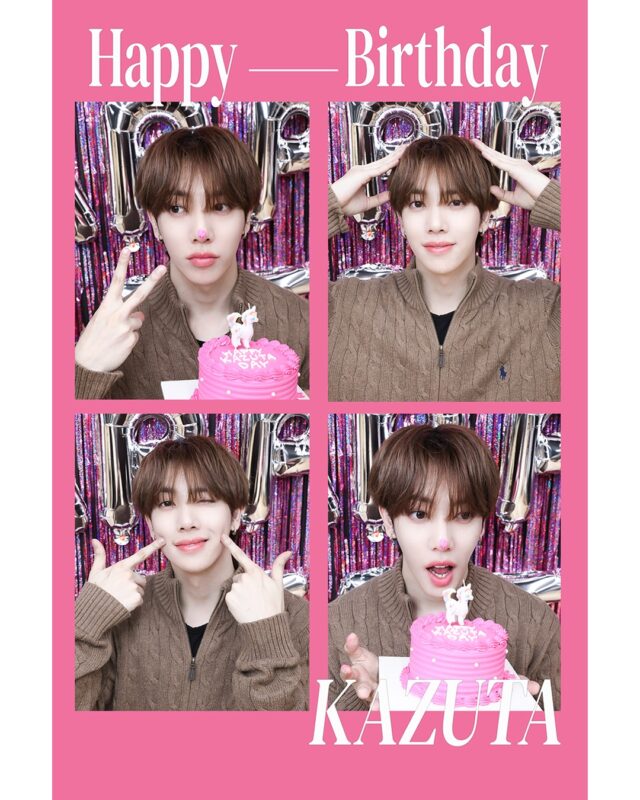 写真には、ピンクのケーキを持ったカズタの姿が盛り込まれている。