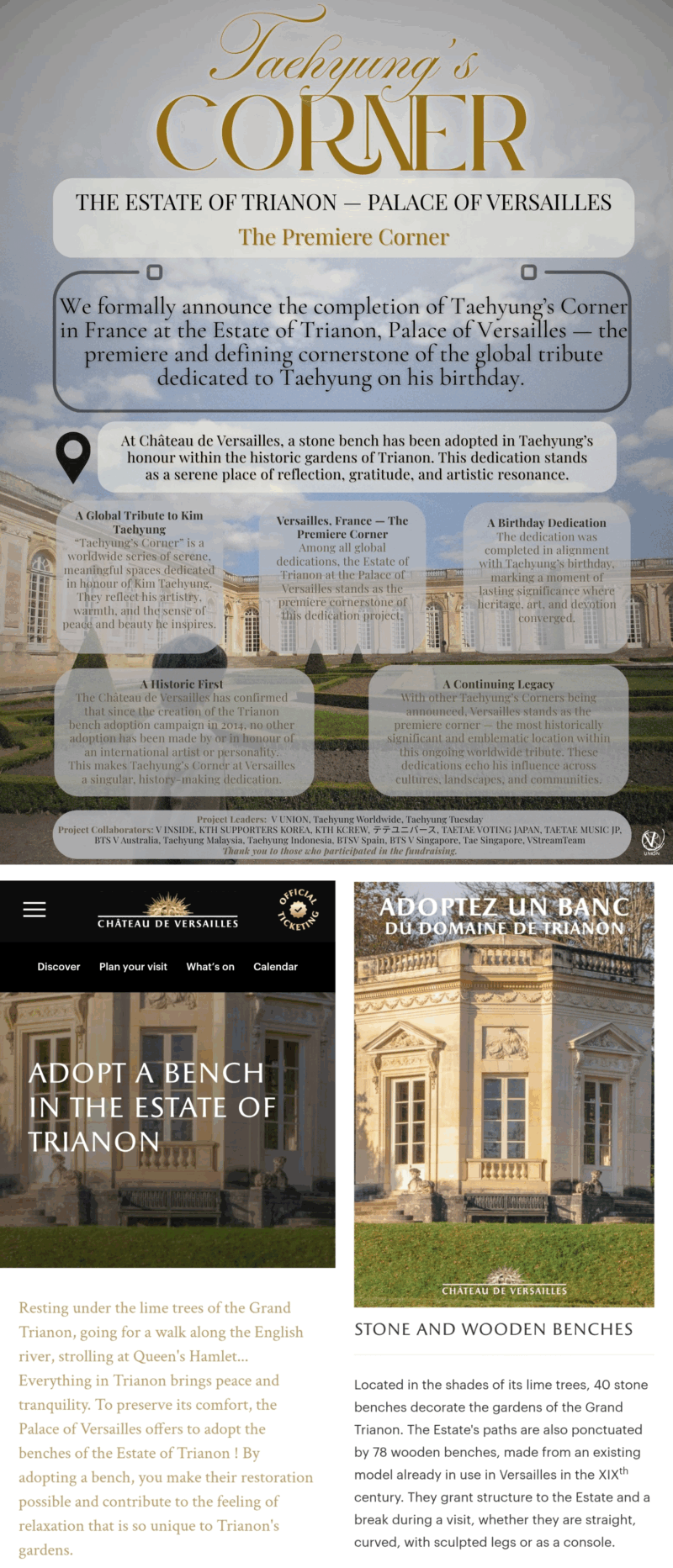 トリアノン庭園には全部で40個の石のベンチと78個の木製ベンチが配置されている。この中で石のベンチのひとつがVの名前で献呈された。「KIM Taehyung」と刻まれた小さな銅版がベンチのすぐ横の床に設置され、ベンチの保護を考慮した方式で設けられた。
