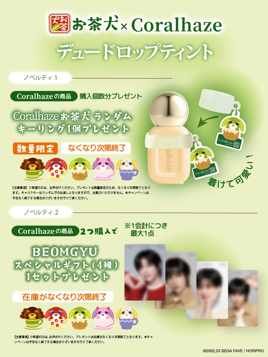 また発売を記念し、同日よりPLAZA・ハンズ・ロフト(一部店舗除く)にて、Coralhaze商品をご購入いただいたお客様を対象に、「お茶犬ランダムキーリング」を購入者特典として配布いたします。