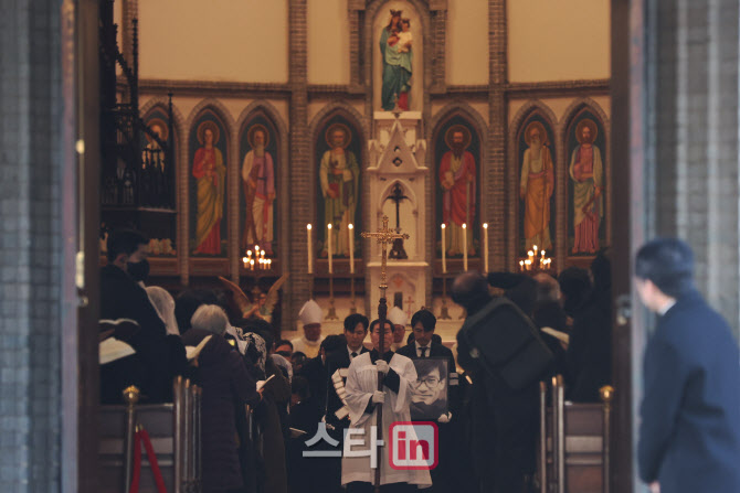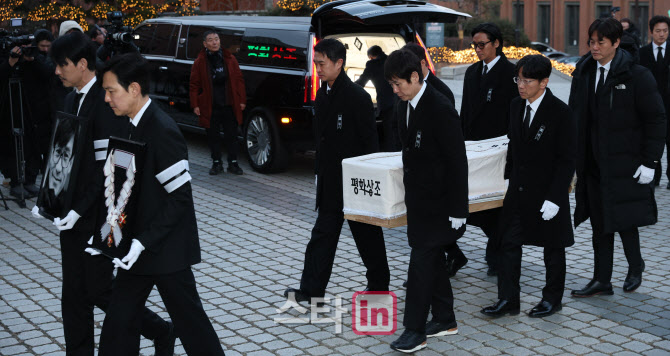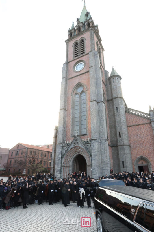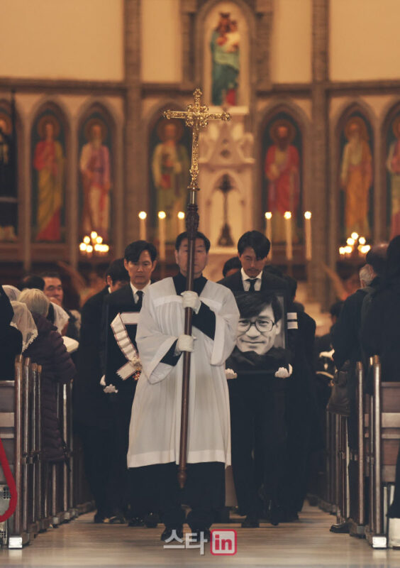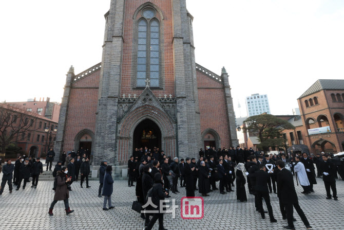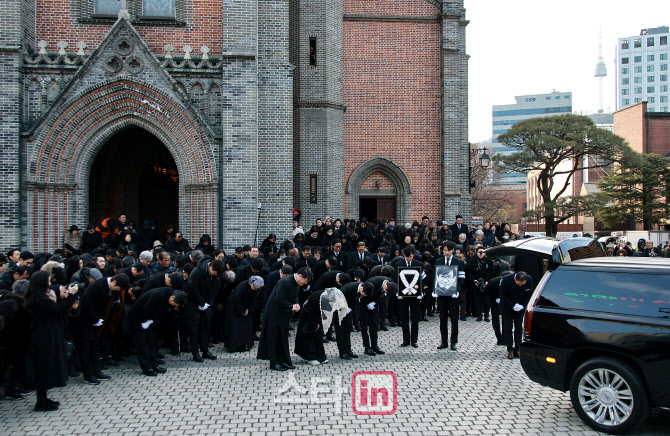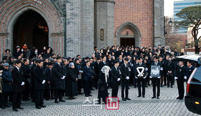 俳優のチョン・ウソンとイ・ジョンジェが9日午前、ソウル市チュング(中区)のミョンドン(明洞)聖堂で執り行われた故アン・ソンギさんの葬礼ミサを終え、聖堂を後にしている。