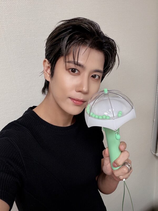 キュジョンはグリーンの「FIVE O ON」のペンライトを持って、ファンに感謝の思いを支援している。