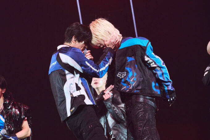 「Handz In My Pocket」で再びダンスナンバーへと戻ると、その後はエネルギッシュな楽曲の連続。「Trigger」「YOLO-konde」はDJライクなアレンジが加えられ、観客も飛び跳ねながらフェスらしい高揚感を共有。さらにマッシュアップで繋げられた「Eyes On Me (feat.R3HAB)」は、世界トップクラスのDJ兼プロデューサーであり、昨年『GMO SONIC 2025』では共演もしたR3HABが手がけた一曲。DJカルチャーをルーツに持つダンサブルな楽曲をフロア直撃型のハードEDMアレンジにさせ、会場を揺らすキックとアグレッシブなシンセが圧倒的な没入感を生み出します。入り乱れる照明やレーザーの中、佐藤景瑚、豆原一成がまるでダンスバトルかのようにステージ中央でフリースタイルのダンスを繰り広げ、会場を大いに沸かせました。