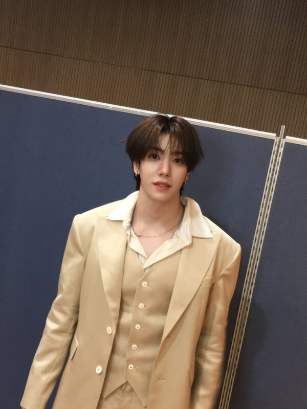写真には、クリーム色のスーツを着たカズタの姿が収められている。