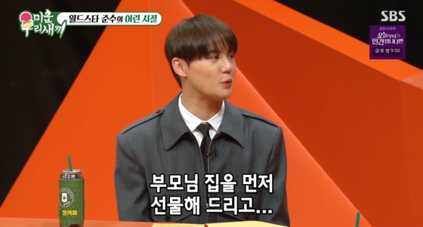 この日、ジュンスは豪華な自宅を紹介した。シン・ドンヨプは「家をとても大事にしている理由が、幼い頃に劣悪な環境で暮らしていたからだと聞いた」と質問した。ジュンスは、経済的に苦しかった当時を振り返りながら、「今思えば、本当につらい生活だった。映画『パラサイト 半地下の家族』に出てくる家族が半地下に住んでいたが、僕たちも、あんな半地下の家に住んでいた」と明かした。 続けて、「でも、映画ではリビングや部屋、トイレがあったが、僕たちにはそれすらなかった。たった一間だけだった。トイレもなかった」と語った。 さらに、「流し台で用を足して、新聞紙を敷いたりしていた。キッチンも部屋の中にあるのではなく、外に出るような形の台所だった」と語り、「今考えると、本当の家というよりは、倉庫を家のように使っていたんじゃないかと思う。その頃から、いい家に住みたいという目標を持つようになった」と打ち明けた。ジュンスはまた、「デビュー後はずっと宿舎生活だったので、まず両親に家をプレゼントした」と話し、スタジオの母親パネラーたちは「本当に親孝行だ」と拍手を送った。