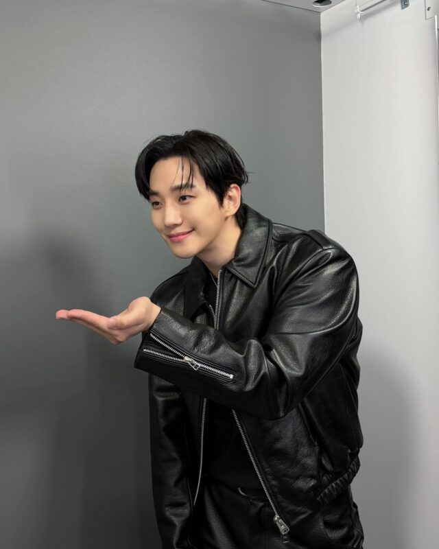写真には、ブラックのレザージャケットを着て花束を持って微笑むジュノの姿が収められている。