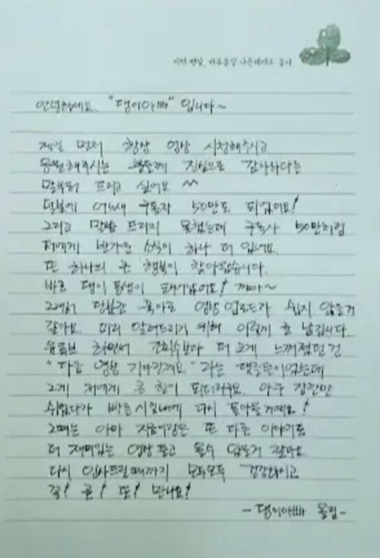チョ・ジョンソクは19日、自身のYouTubeチャンネル「チョンゲサン(清渓山)デンイレコーズ」に投稿した直筆の手紙を通じ、「いつも動画を視聴し応援してくださる方々に心から感謝する」と切り出した。