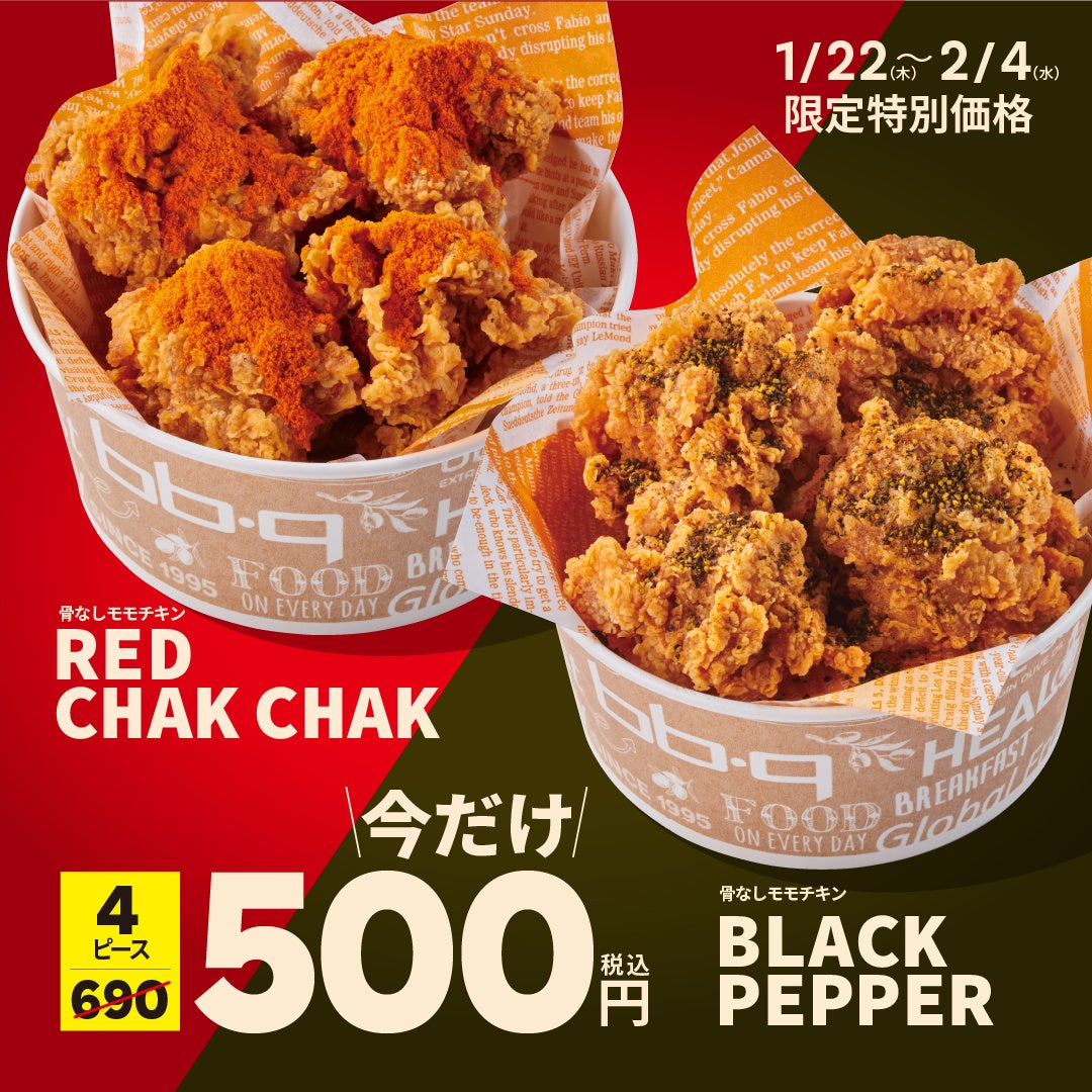 bb.q オリーブチキンカフェでは、定番フレーバーとして親しまれている「レッドチャクチャク」と「ブラックペッパー」を、期間限定の特別価格でご提供します。いずれも、bb.q自慢のサクサクとした衣とジューシーな鶏モモ肉が特徴の骨なしモモチキンに、それぞれ異なる刺激を加えた人気の味わいです。