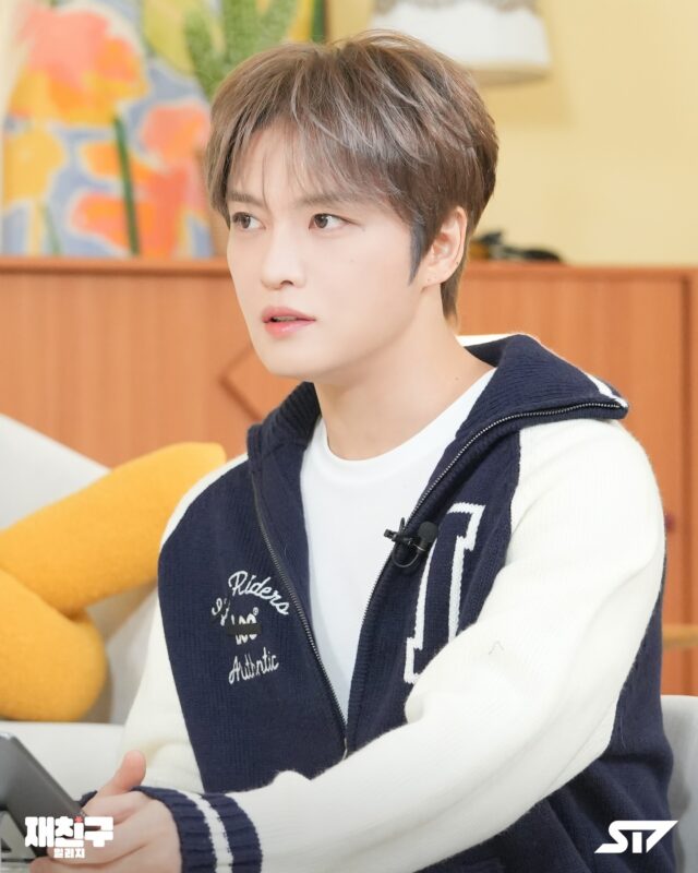 公開された写真には、ホワイトとネイビーのスタジャンを着たジェジュンの姿が収められている。