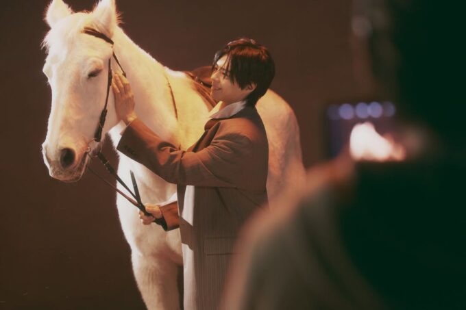 公開された写真には、シャープな横顔と吸い込まれるような眼差しでモニターを注視し、撮影に没頭するパク・ボゴムの姿が収められている。特に白馬と共演するカットでは、優雅さと力強さを兼ね備えた高貴な騎士を彷彿とさせ、見る人を魅了する。