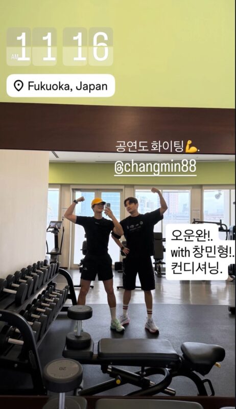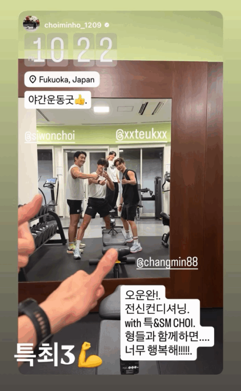 31日、チャンミンは福岡のジムで撮影された写真を自身のSNSに投稿。公開された写真には、30日と思われる午後10時22分と書かれた夜遅い時間に、トレーニングウェア姿の4人が和やかな雰囲気でポーズを決める様子が収められており、さらに「夜間運動、いいね」「今日の運動完了」「全身コンディショニング」といったコメントが添えられている。