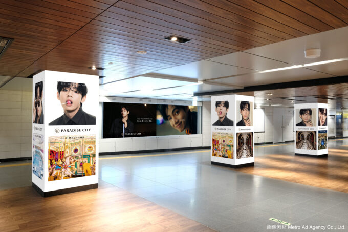 なお、パラダイスシティ内にある屋内型テーマパーク「ワンダーボックス」を背景にしたビジュアルは、今回の銀座駅構内での広告展開にて世界初公開となります。メリーゴーランドとともに軽やかに切り取られた、無邪気さと解放感がにじむV氏の表情は、ファンならずとも必見の仕上がりです。