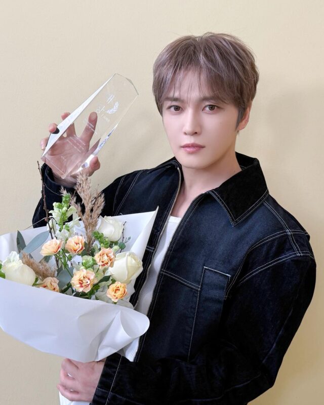 写真には、クリスタルの盾と花束を持っているジェジュンの姿が収められている。