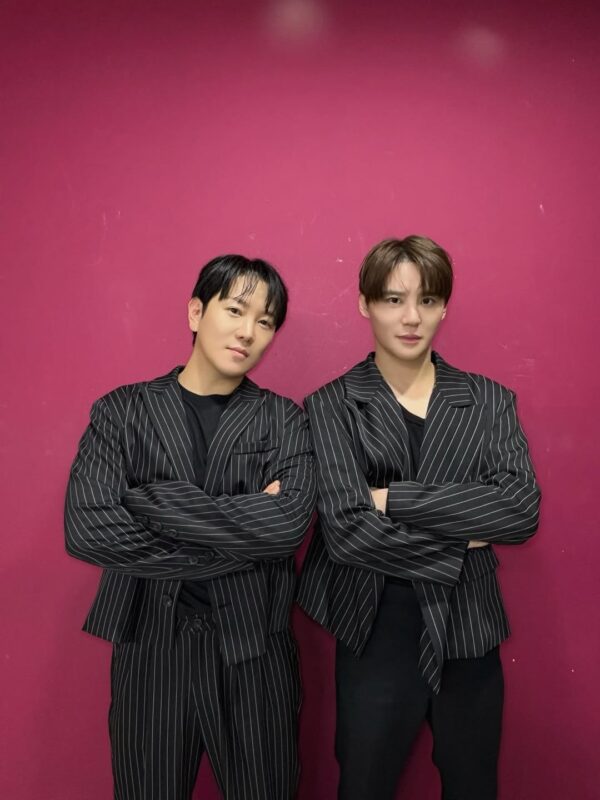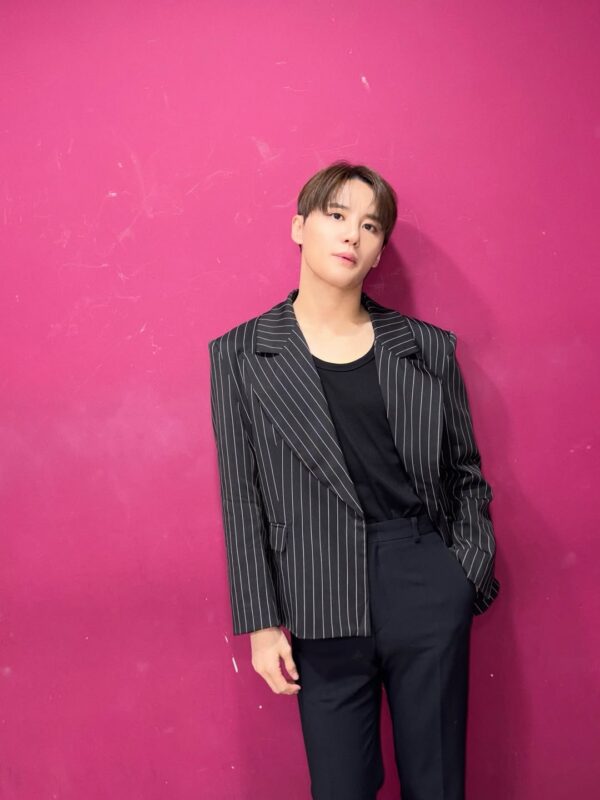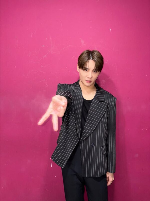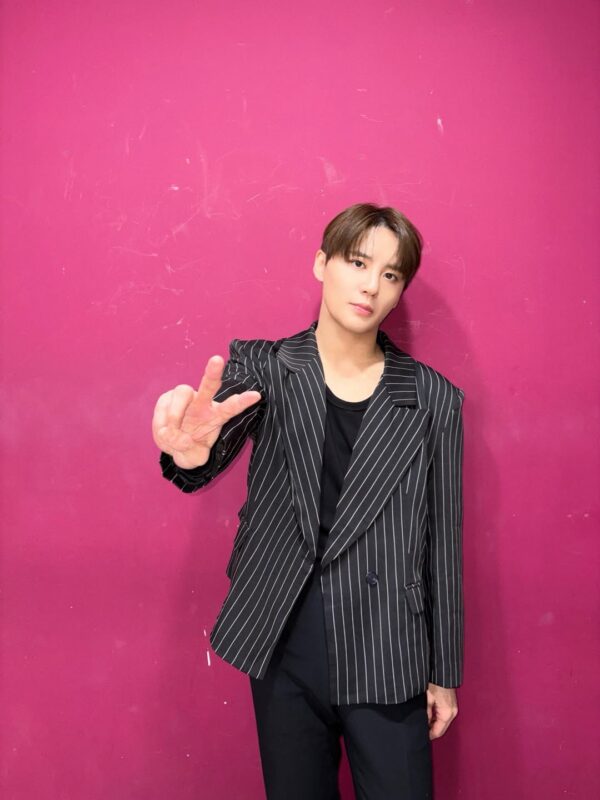 写真には、鮮やかなピンクの壁を背景に、ブラックのストライプジャケットを着たジュンスの姿が収められている。