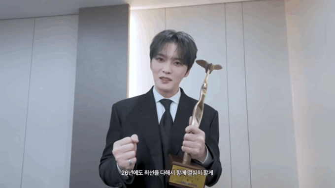 記念撮影を終えたジェジュンは、「新人賞で呼ばれなかったので、最後まで楽しんでいこうと思っていました。こんな新米に大きな賞をくださって感謝しています。緊張していて、何を言ったのか覚えていません。ファンのみなさん、ありがとう。2026年も頑張ります」とあいさつした。
