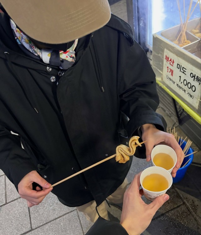 今回共に公開された写真には、購入したたい焼きを口にくわえ、街角に立っているVの姿が盛り込まれている。